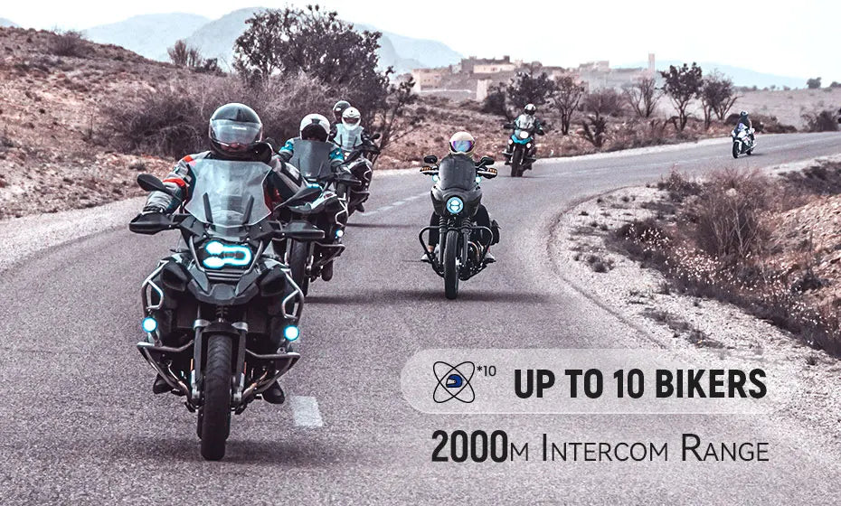 Talk to your crew like never before—connect up to 10 riders with a range of up to 2000 meters in ideal conditions. Real-world range: 300–800 meters between each rider.
