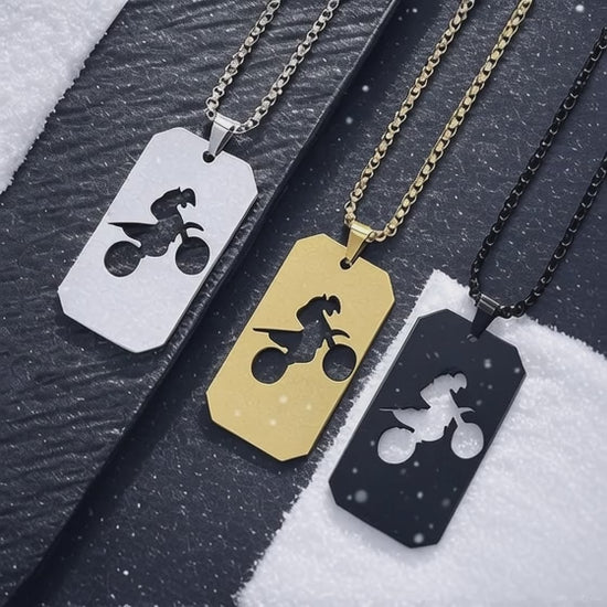 Crafted from mirror-polished stainless steel, The Moto Chain features a precision-cut rider silhouette that’s clean, bold, and built to represent the lifestyle. Select between: Black. Silver or Gold.